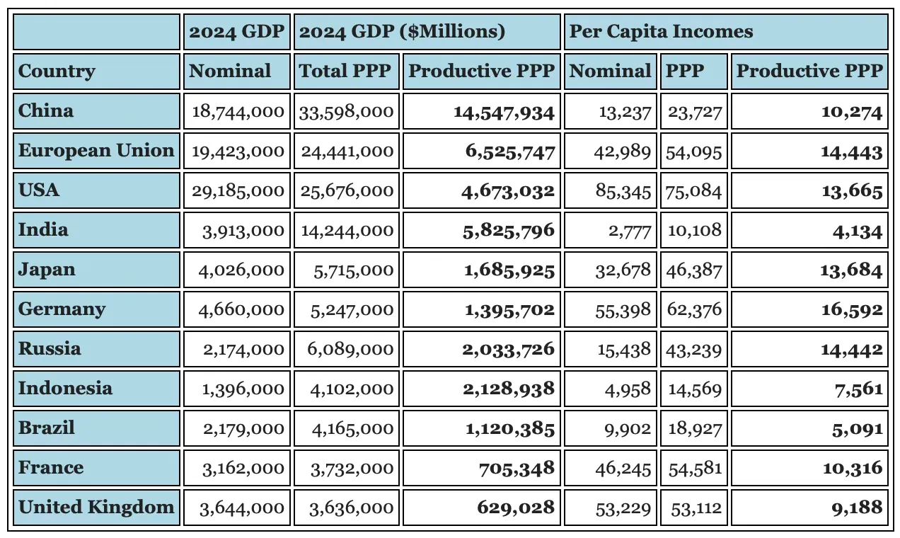Le mois dernier, j’ai mis à jour les estimations internationales standard de la puissance économique des principaux pays et blocs mondiaux, afin d’y intégrer les dernières statistiques financières pour 2024. Ces chiffres ont simplement confirmé que le potentiel productif réel de l’économie chinoise, parfois considéré comme la mesure la plus fiable de la puissance économique internationale, surpasse désormais largement celui de l’ensemble de l’Occident, y compris avec notre vassal japonais :