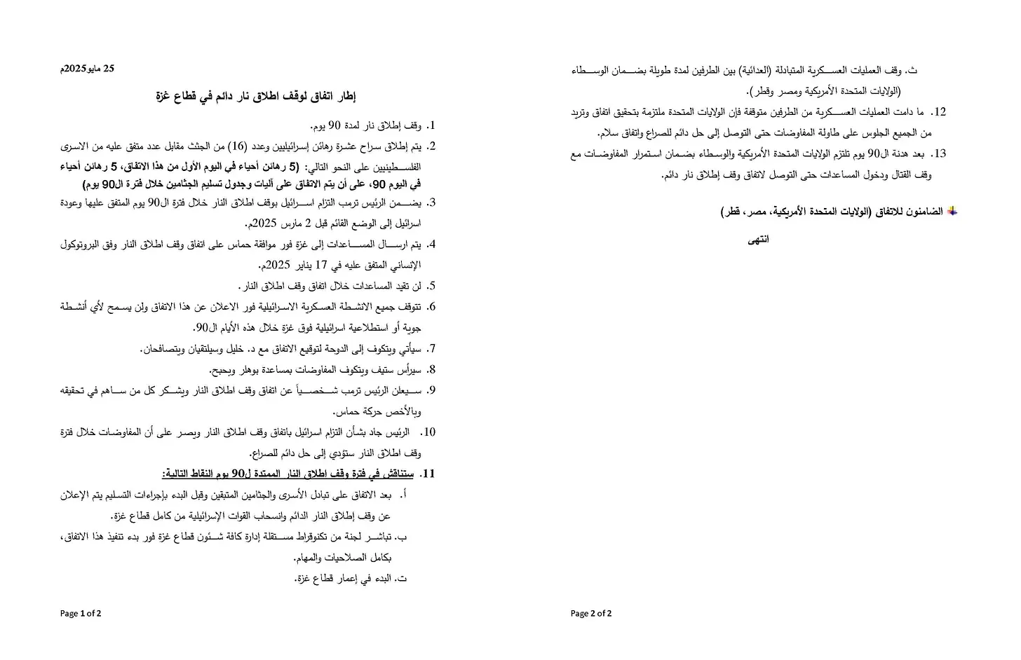 d. L’arrêt définitif des opérations militaires (hostiles) entre les deux parties sera garanti par les médiateurs (les États-Unis, l’Égypte et le Qatar).