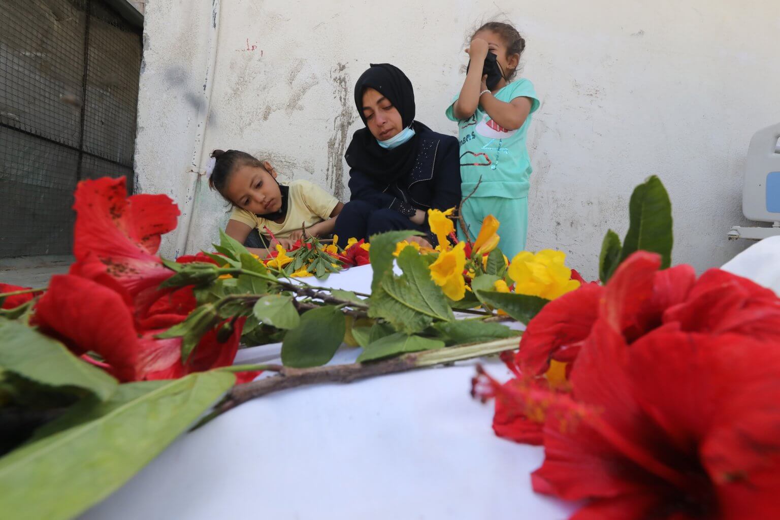 Les Palestiniens qui ont pu identifier leurs proches sont venus avec des fleurs pour transporter les corps jusqu’à leur dernière demeure (Photo © Omar Ashtawy)