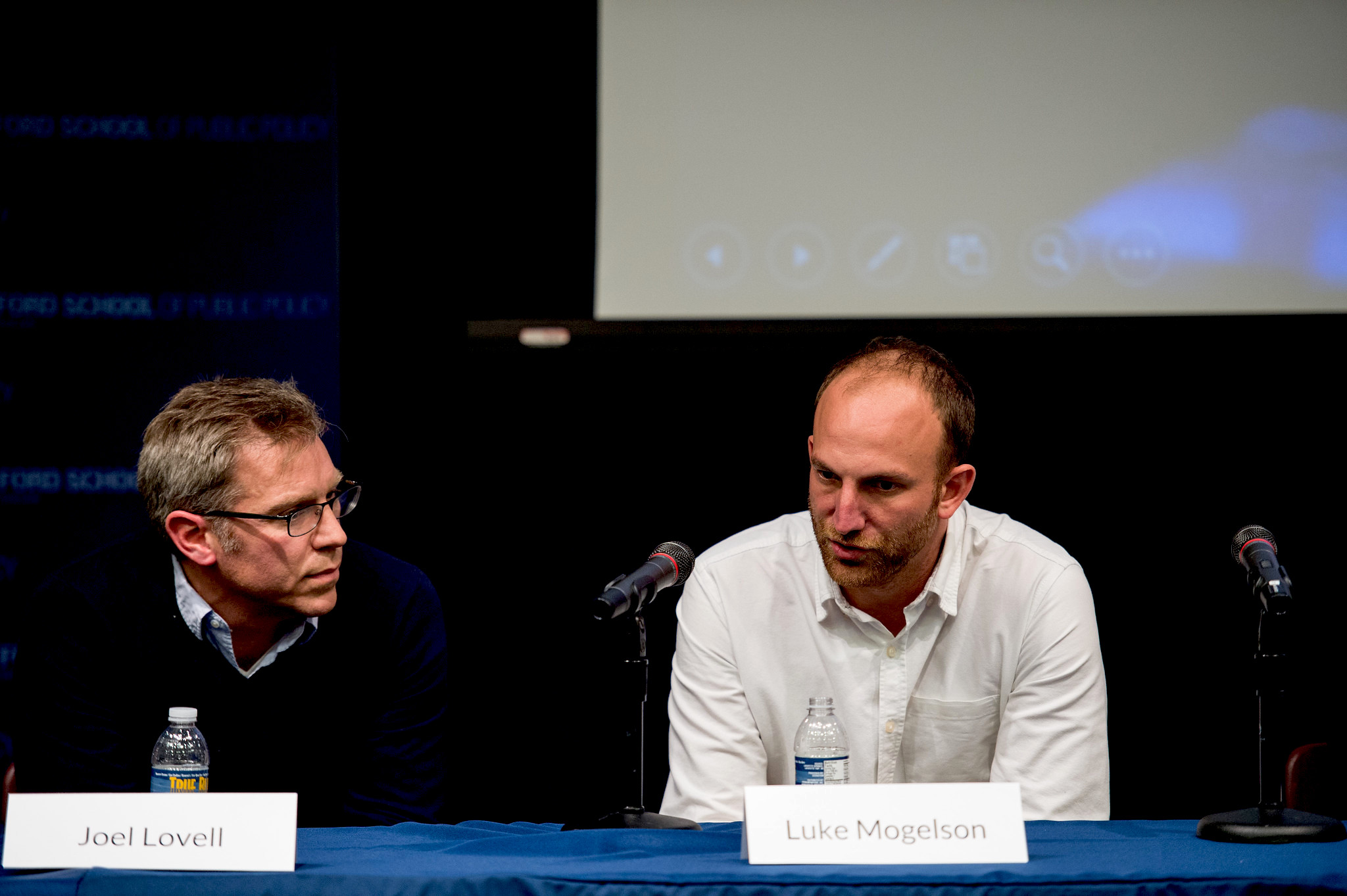 Luke Mogelson, à droite, lors d’une table ronde en 2015 sur sa couverture des demandeurs d’asile politiques.