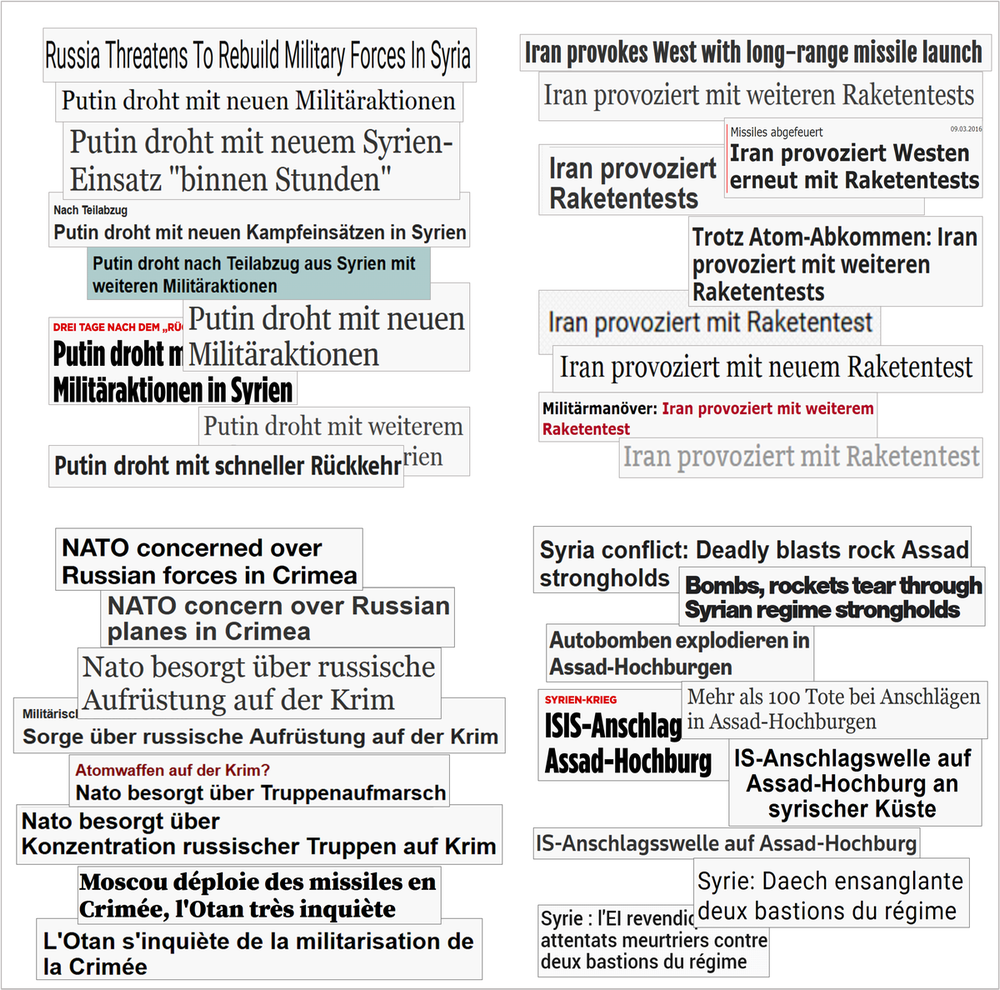 Voici des exemples tirés de publications allemandes et internationales. On peut voir que malgré l’objectivité qu’elles revendiquent, un léger biais géopolitique apparaît parfois.