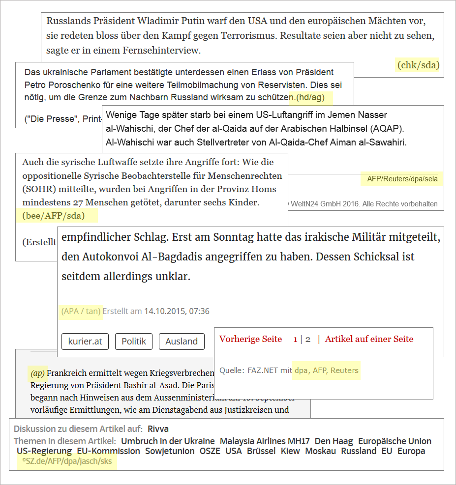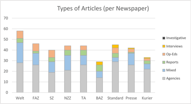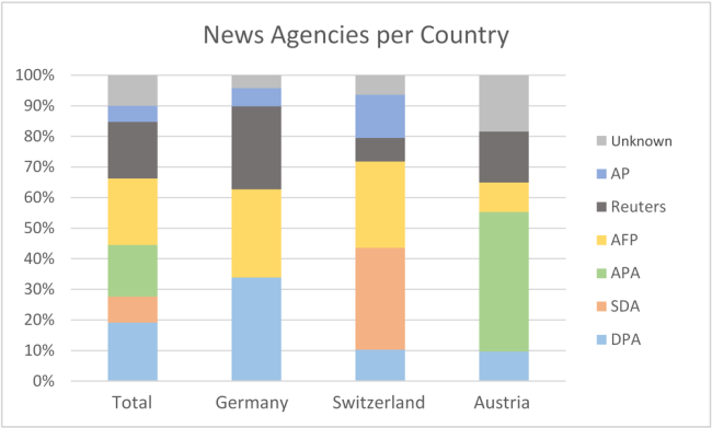 Selon le journal, la part des articles d’agence est de presque 50 % (WeltSüddeutscheNZZBasler Zeitung), presque 60 % (FAZTagesanzeiger), entre 60 % et 70 % (PresseStandardKurier). Si on y ajoute les articles basés sur des articles d’agence, la proportion dans chaque journal varie entre 70 % et 80 %. Ces proportions sont cohérentes avec les précédentes études sur les médias (Blum 1995, Johnston 2011, MacGregor 2013, Paterson 2007).