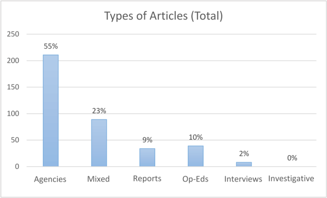 La figure 1 ci-dessous montre la composition des articles pour les neuf journaux étudiés. On peut voir que 55 % des articles venaient des agences et qu’aucun article n’était le résultat d’une investigation.
