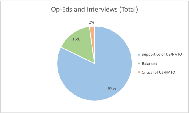 Comme le montre la figure 4, 82 % des contributions étaient favorables aux USA/OTAN, 16 % étaient neutres ou équilibrés, et 2 % étaient critiques vis-a-vis des USA/OTAN (un seul article).