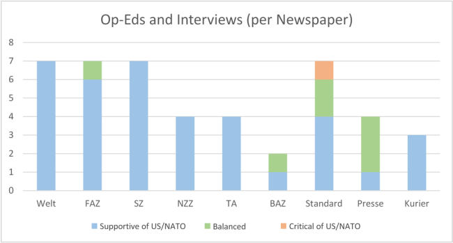 La figure 5 ci-dessous montre l’orientation des contributions, des commentaires et des interviewes, répartis par journal. On peut voir que WeltSüddeutscheNZZTagesanzeiger et le journal autrichien Kurier présentent exclusivement des opinions favorables aux USA/OTAN. C’est aussi vrai pour FAZ à l’exception d’une contribution neutre ou équilibrée. Le Standard a présenté quatre opinions favorables aux USA/OTAN, trois neutres ou équilibrées, ainsi que la tribune critique sus-mentionnée.