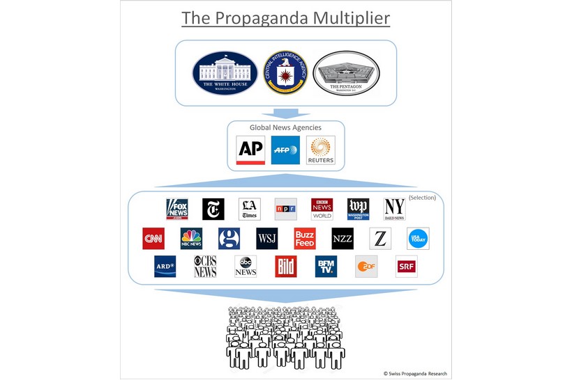 Bien sûr, les services de renseignement disposent aussi d’un grand nombre de contacts directs dans les médias, à qui ils peuvent divulguer des informations si nécessaire. Mais sans le rôle central que jouent les agences de presse mondiales, la synchronisation mondiale de la propagande et de la désinformation ne pourrait être si efficace.