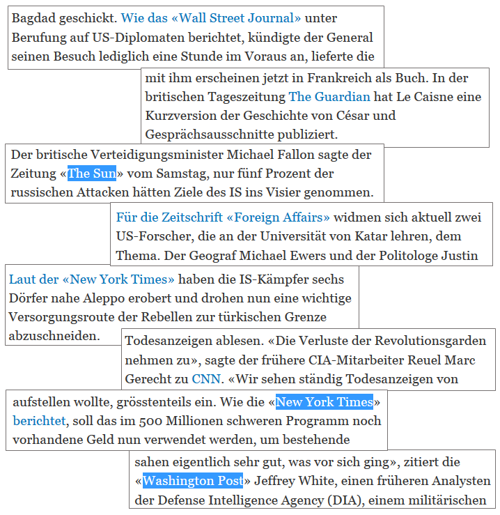 Voici quelques exemples de ces références aux grand médias anglo-saxons, relevés dans le plus grand quotidien de Suisse, Tages-Anzeiger, au sujet de la Syrie. Ces articles datent tous d’octobre 2015, lorsque la Russie est intervenue directement pour la première fois (les sources US/UK sont en bleu) :