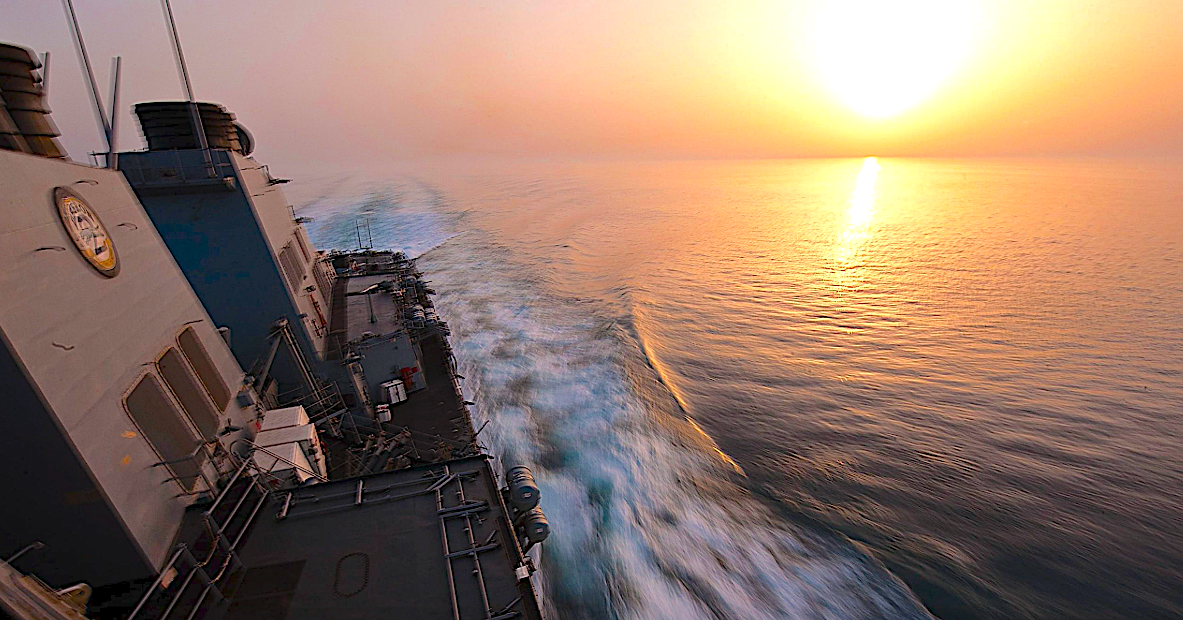 « En 2012, le destroyer lance-missiles USS Porter, déployé au sein de la 5e flotte américaine, transite par le détroit d’Ormuz. (U.S. Navy/Alex R. Forster) »