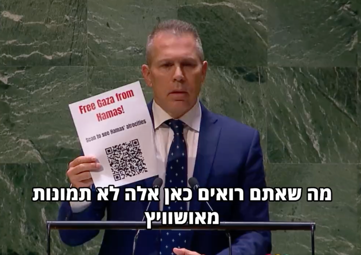 L’ambassadeur d’Israël auprès des Nations unies, Gilad Erdan, semble avoir fait la promotion de photos montrant des combattants du Hamas morts lors de sa tirade du 26 octobre aux Nations unies. M. Erdan a gesticulé avec colère sur le podium, beuglant que « nous combattons des animaux » avant de sortir un papier affichant un QR code légendé « Scannez pour voir les atrocités du Hamas ».