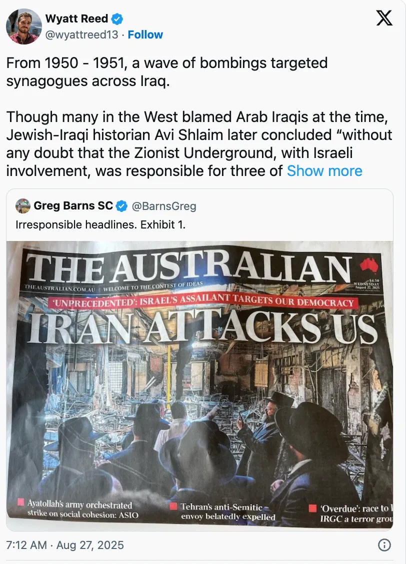 Il est très probable qu’un plan similaire ait été mis en place en Australie bien plus récemment. Lorsqu’une vague d’attaques contre les communautés juives a rapidement suivi la décision du Premier ministre australien Antony Albanese de reconnaître un État palestinien en 2025, les médias là-bas ont immédiatement rejeté la faute sur l’Iran. Cette croyance, il s’est avéré, était également fondée sur l’influence israélienne.