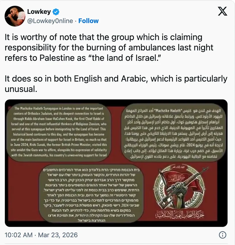 Dans les documents du groupe, le logo change considérablement d’un message à l’autre, ce qui suggère fortement qu’ils ont été créés à la hâte avec l’IA. Les communiqués contiennent également un langage hautement discutable, à commencer par une déclaration du 20 mars faisant référence à la « nation d’Israël ». Un article publié quelques jours plus tard, s’invoquant pour avoir brûlé des ambulances à Londres, faisait référence à quatre reprises en anglais et en arabe à « Israël » ou « la Terre d’Israël ». La traduction hébraïque de la déclaration soulevait encore plus de questions, car elle qualifiait le déménagement d’un rabbin dans le pays de « faire son aliyah à la Terre d’Israël » – une expression utilisée presque exclusivement par les sionistes.
