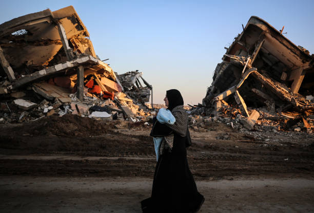 Des Palestiniens marchent le long de la rue Salah al-Din, entre les maisons détruites du quartier d’Al-Zaytoun, à Gaza, le 14 février 2025. (Photo de Majdi Fathi/NurPhoto via Getty Images)